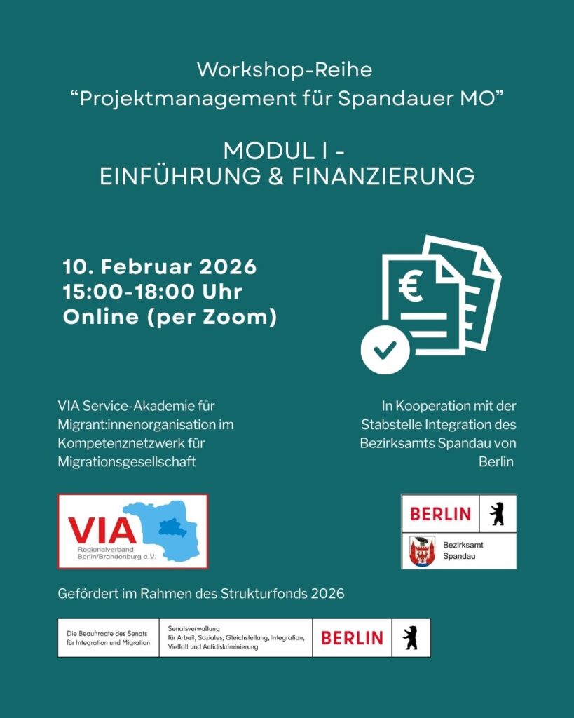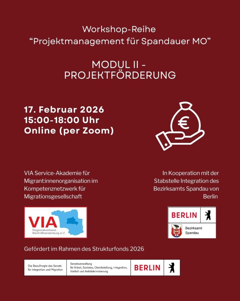 VIA Service-Akademie für MO | 17.02.2026 | Workshopreihe: Projektmanagement für Spandauer MO – Modul II „Projektförderung“