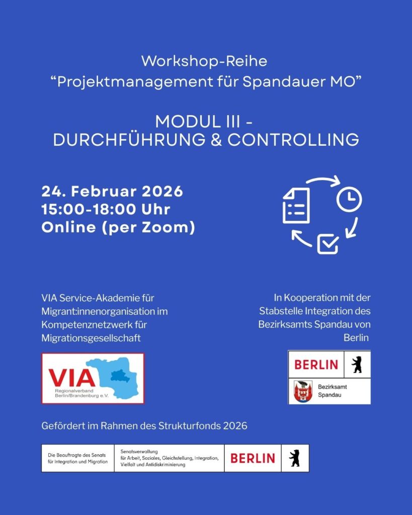 VIA Service-Akademie für MO | 24.02.2026 | Workshopreihe: Projektmanagement für Spandauer MO – Modul III „Durchführung & Controlling“
