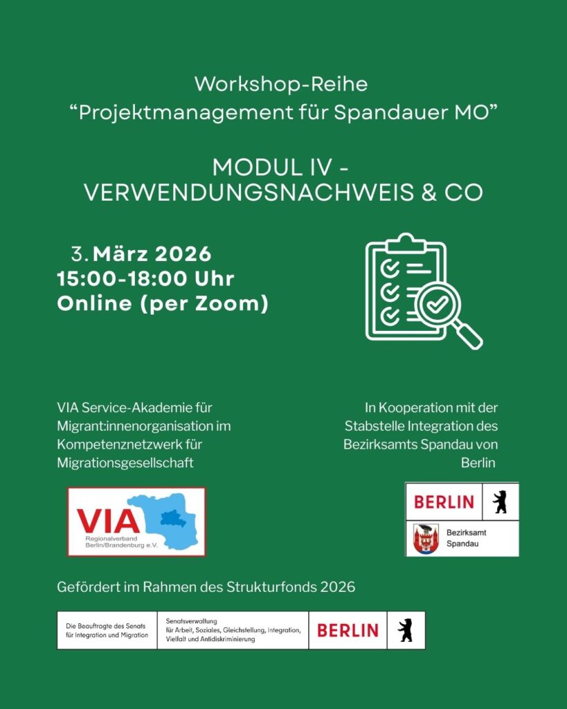 VIA Service-Akademie für MO | 03.03.2026 | Workshopreihe: Projektmanagement für Spandauer MO – Modul IV „Verwendungsnachweis & Co“